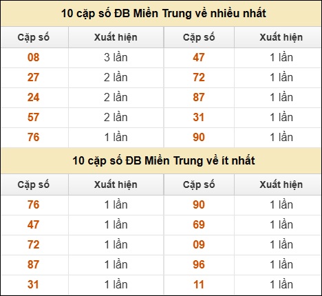 ⚡ 10 cặp số ĐB XSMT về nhiều nhất/ ít nhất tính dến ngày 29/07/2025: