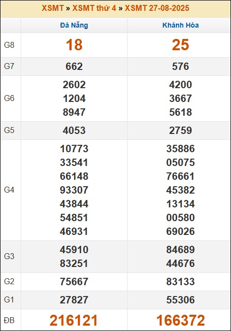 Kết quả xổ số Miền Trung 27/08/2025 thứ 4 tuần trước