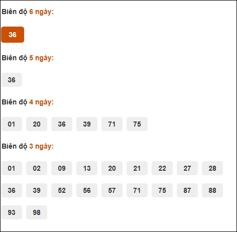 Đuôi 8: 13 ngày, Đuôi 4: 10 ngày, Đuôi 1: 6 ngày, Đuôi 9: 6 ngày, Đuôi 5: 3 ngày