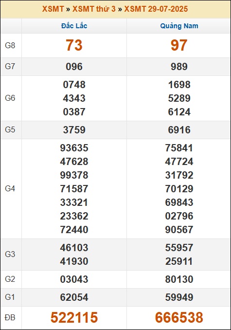 Kết quả xổ số Miền Trung 29/7/2025 thứ 3 tuần trước