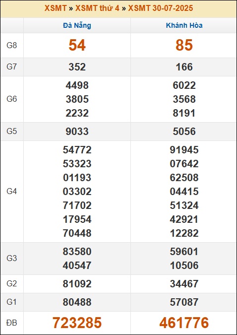 Kết quả xổ số Miền Trung 30/7/2025 thứ 4 tuần trước