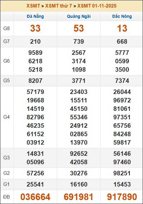 Kết quả xổ số Miền Trung 01/11/2025 thứ 7 tuần trước