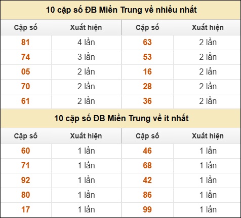 ⚡ 10 cặp số ĐB XSMT về nhiều nhất/ ít nhất tính dến ngày 08/11/2025: