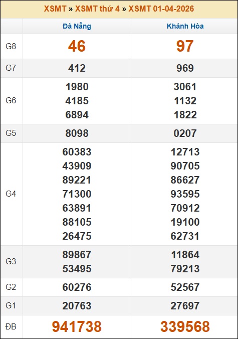 Kết quả xổ số Miền Trung 01/04/2026 thứ 4 tuần trước