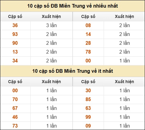 ⚡ 10 cặp số ĐB XSMT về nhiều nhất/ ít nhất tính dến ngày 09/01/2026: