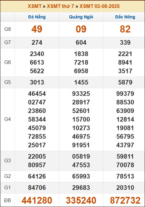 Kết quả xổ số Miền Trung 09/08/2025 thứ 7 tuần trước