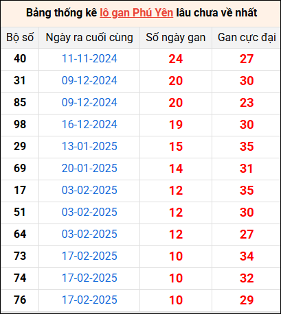 Bảng thống kê lô gan Phú Yên lâu về nhất 5/5/2025