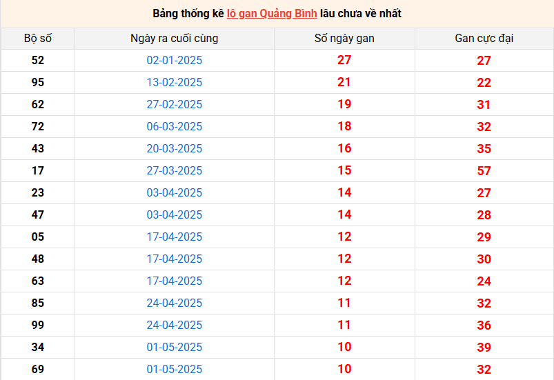 Bảng thống kê lô gan Quảng Bình lâu về nhất 17/7/2025