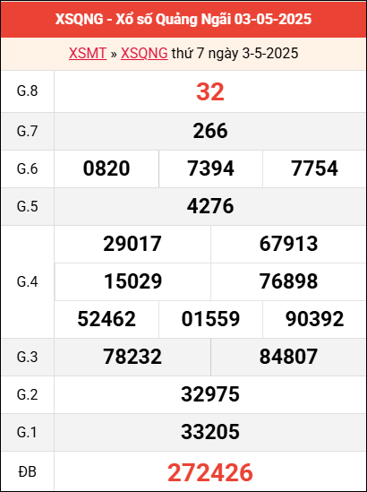 Mời các bạn xem lại bảng kết quả kỳ trước với giải đặc biệt, giải tám, lô tô 2 số để có thể đưa ra nhận định dự đoán QNG ngày 10 tháng 5 năm 2025 chuẩn xác nhất.