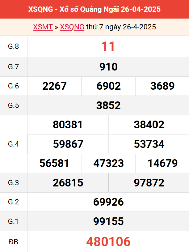 Bảng kết quả Quảng Ngãi ngày 26/4/2025 tuần trước