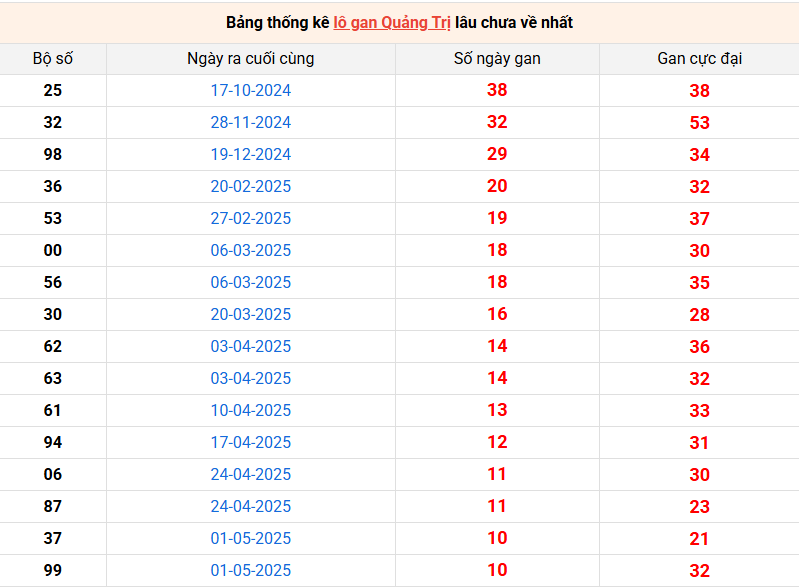 Bảng thống kê lô gan Quảng Trị lâu về nhất 17/7/2025