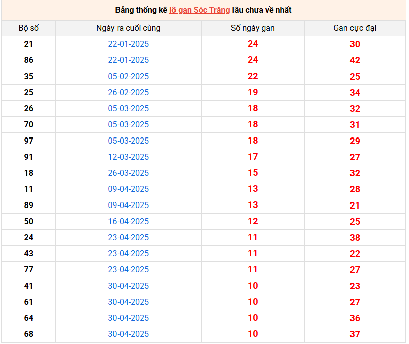 Bảng thống kê lô gan Sóc Trăng lâu về nhất 16/7/2025