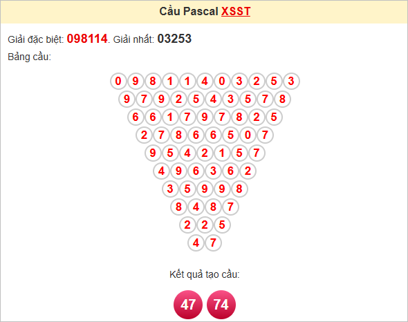 Soi cầu Sóc Trăng hôm nay theo phương pháp soi cầu Pascale Sóc Trăng, lấy giải đặc biệt và giải nhất tạo thành tam giác như sau: