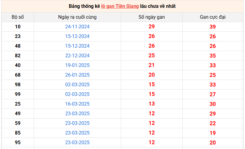 Bảng thống kê lô gan Tiền Giang lâu về nhất 22/6/2025
