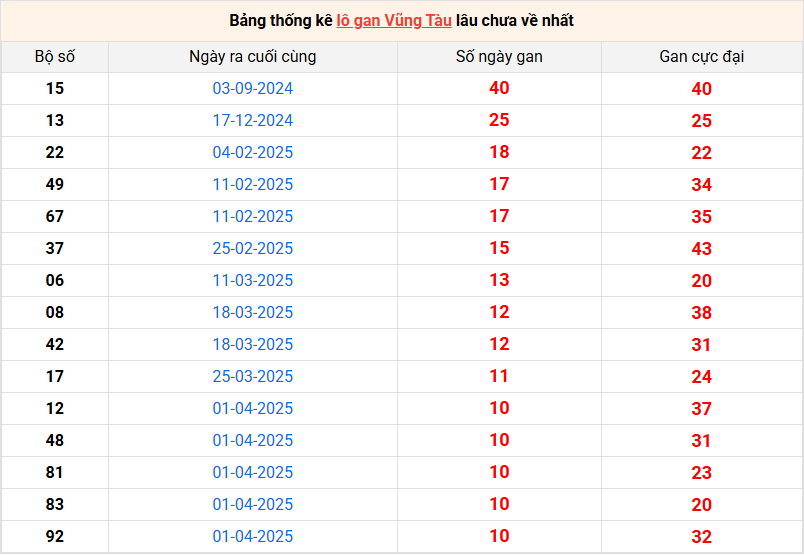 Bảng thống kê lô gan Vũng Tàu lâu về nhất 24/6/2025