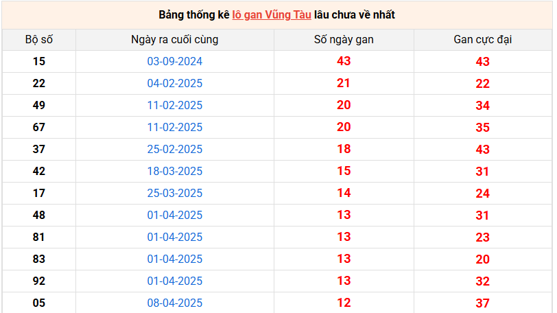 Bảng thống kê lô gan Vũng Tàu lâu về nhất 8/7/2025