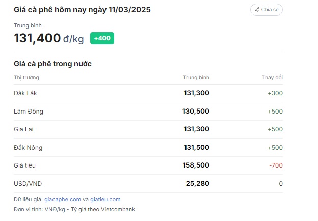 Giá cà phê tại Đắk Nông cũng ghi nhận mức tăng 500 đồng/kg, giao dịch ở mức 131.500 đồng/kg.