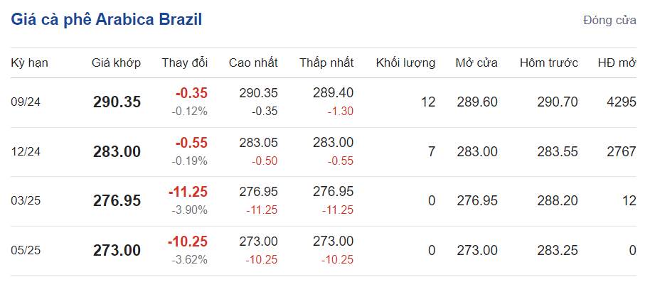 Giá cà phê Arabica Brazil sáng ngày 11/8/2024 giảm mạnh. Cụ thể, kỳ hạn giao hàng tháng 09/2024 là 290.35 USD/tấn (giảm 0.12%); kỳ giao hàng tháng 12/2024 là 283.00 USD/tấn (giảm 0.19%); kỳ giao hàng tháng 3/2025 là 276.95 USD/tấn, (giảm 3.90%) và giao hàng tháng 5/2025 là 273.00 USD/tấn (giảm 3.62%).