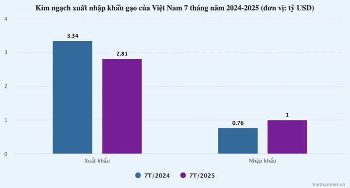 Theo Bộ Nông nghiệp và Môi trường, tuy xuất khẩu giảm, còn nhập khẩu lại tăng mạnh, gạo vẫn là một trong 6 mặt hàng có kim ngạch xuất siêu cao nhất của ngành nông nghiệp trong 7 tháng qua.
