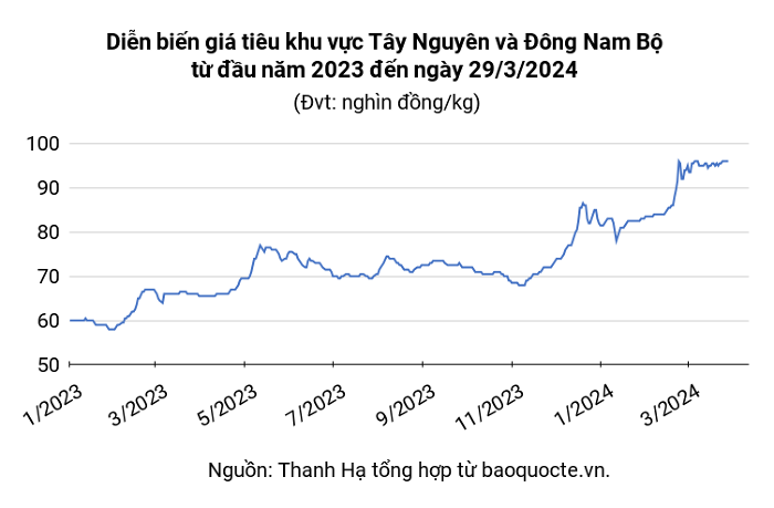 Trong khi đó, tại những nước có sản lượng hạt tiêu lớn, Brazil đã qua mùa thu hoạch, Việt Nam bước vào mùa, trong khi chính vụ của Indonesia và Malaysia vào tháng 7 hàng năm. Hiện hạt tiêu của Việt Nam chiếm 60% thị phần xuất khẩu, tuy nhiên lượng xuất khẩu trong 2 tháng đầu năm 2024 giảm mạnh.