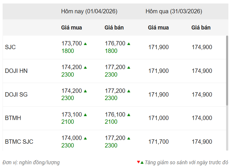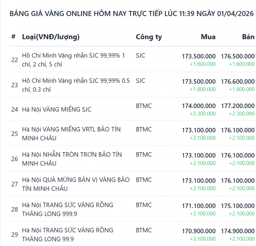 Giá vàng hôm nay 1/4, tính đến 11h28, ghi nhận kim loại quý này tiếp tục tăng mạnh khoảng 1,8–2,3 triệu đồng/lượng tại các thương hiệu lớn.