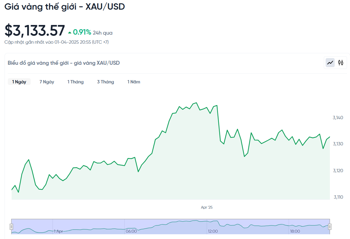 Giá vàng thế giới hôm nay 2/4/2025 và biểu đồ biến động giá vàng thế giới 24h qua