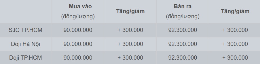 Tập đoàn Vàng bạc đá quý Doji đầu giờ sáng nay giao dịch vàng nhẫn 9999 với mức giá 90,8-92,3 triệu đồng/lượng (mua - bán), tăng 300 nghìn đồng mỗi lượng ở cả chiều mua vào và bán ra so với mức chốt hôm qua.