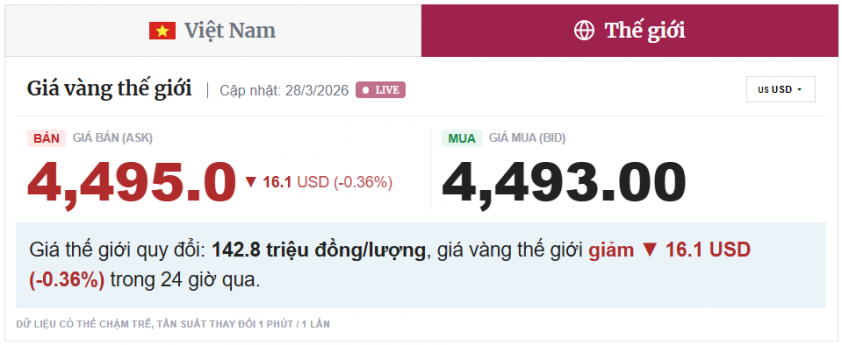 Theo dữ liệu mới nhất, giá vàng thế giới hiện đang niêm yết ở mức 4,493 USD/ounce chiều mua vào và 4,495 USD/ounce chiều bán ra, giảm nhẹ 16.1 USD/ounce trong 24 giờ qua. Tuy vậy, so với số liệu ghi nhận tối ngày hôm qua 27/3, vàng thế giới đã đạt mức tăng rất ấn tượng.