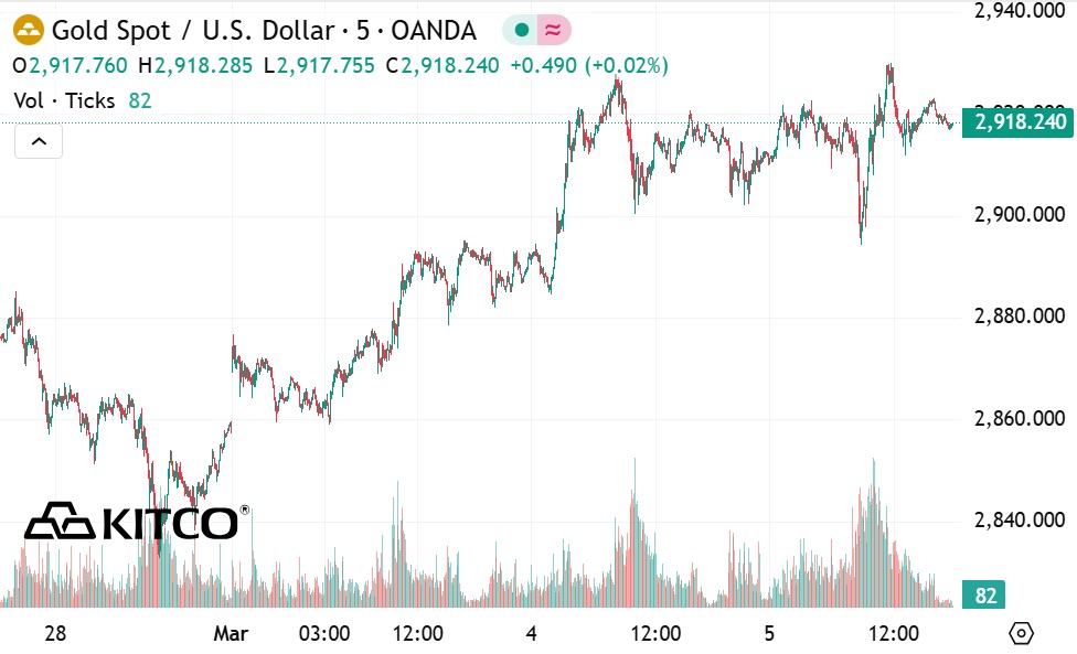 Theo Kitco, Giá vàng đêm qua có thời điểm vọt lên trên 2.922 USD/ounce sau khi chỉ số ISM Services PMI của Mỹ tăng lên.