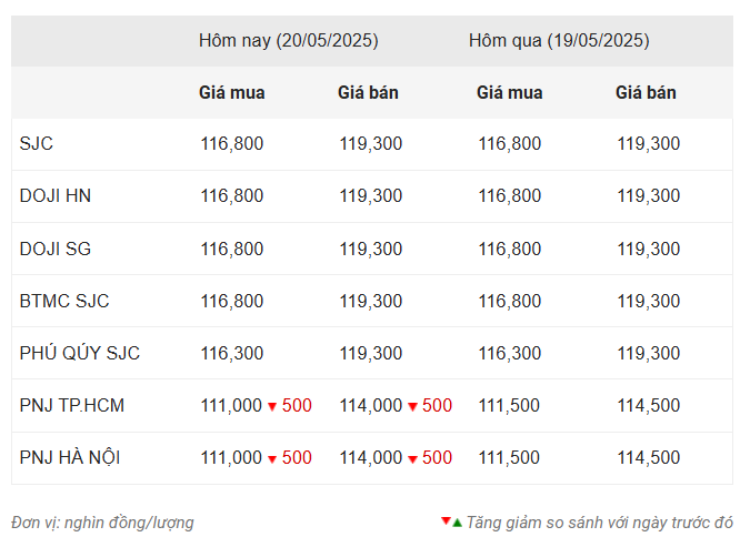 Tính đến 14h18 ngày hôm nay 20/5/2025, giá vàng miếng trong nước tạm thời đi ngang, neo ở mức dưới 120 triệu đồng/lượng tại các hệ thống lớn như SJC, DOJI (Hà Nội và TPHCM) hay Bảo Tín Minh Châu. Theo đó, giá SJC, DOJI (Hà Nội và TPHCM) và BTMC SJC đồng loạt niêm yết ở mức 116,8 triệu đồng/lượng chiều mua vào và 119,3 triệu đồng/lượng chiều bán ra.