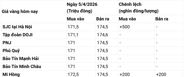 Nhìn tổng thể, giá vàng ngày 5/4/2026 đã giảm nhẹ so với đầu tháng, với mức chênh lệch phổ biến từ 2 – 3 triệu đồng/lượng.