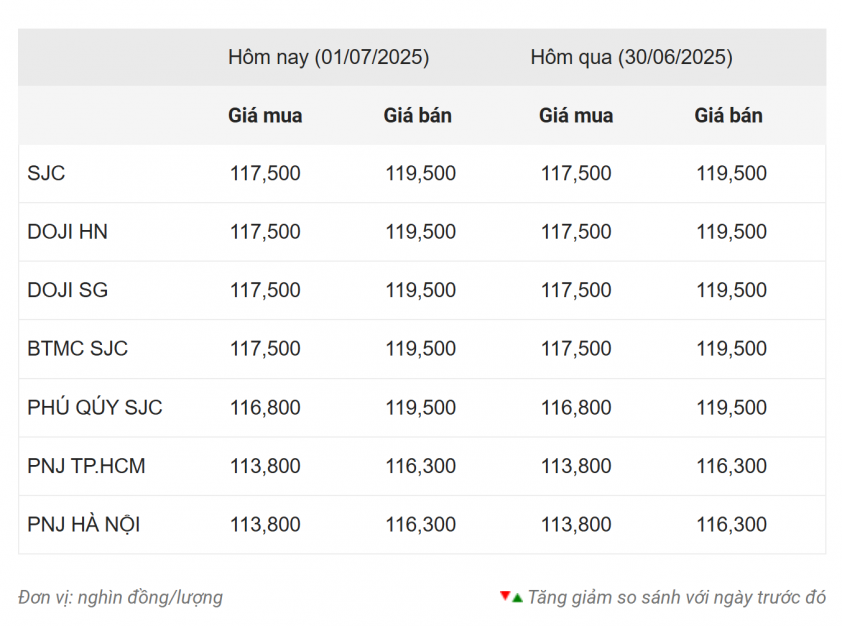 Tính đến 7h30 sáng ngày 1/7/2025, giá vàng miếng SJC tại ba hệ thống lớn SJC, DOJI và BTMC niêm yết ở mức 117,5 triệu đồng/lượng mua vào và 119,5 triệu đồng/lượng bán ra.