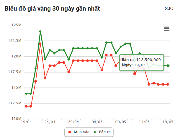 Giá vàng hôm nay ngày 19/5/2025 tính đến 5h02 tạm thời đi ngang ở dưới mốc 120 triệu đồng/lượng, được dự báo sẽ có nhiều biến số bất ngờ trong thời gian tới.