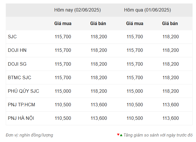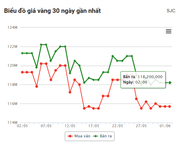 Tính đến 6h04 ngày hôm nay 2/6/2025, giá vàng miếng trong nước tạm thời đi ngang so với lần điều chỉnh gần nhất vào ngày hôm qua, tiếp tục ở dưới mốc 120 triệu đồng/lượng tại các hệ thống lớn như SJC, DOJI (Hà Nội và TPHCM) hay Bảo Tín Minh Châu. Theo đó, SJC, DOJI (HN, TPHCM) và BTMC SJC neo ở mức giá 115,7 triệu đồng/lượng chiều mua vào và 118,2 triệu đồng/lượng chiều bán ra - con số khiến nhà đầu tư phải chịu lỗ nếu giao dịch trong khoảng 1 tháng trở lại đây.