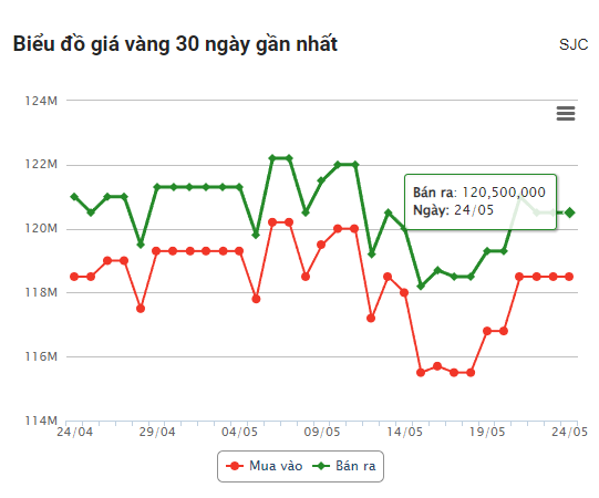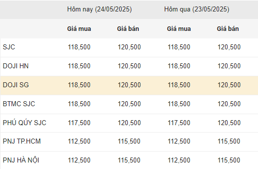 Mặc dù giá vàng thế giới liên tục tăng, thị trường vàng trong nước vẫn giữ xu hướng đi ngang, thậm chí có dấu hiệu giảm. Tính đến 4h30 ngày 24/5/2025, các thương hiệu lớn như SJC, DOJI và Bảo Tín Minh Châu đồng loạt giữ nguyên mức giá vàng miếng ở 118,5 triệu đồng/lượng (mua vào) và 120,5 triệu đồng/lượng (bán ra), không thay đổi so với phiên giao dịch ngày 22/5.