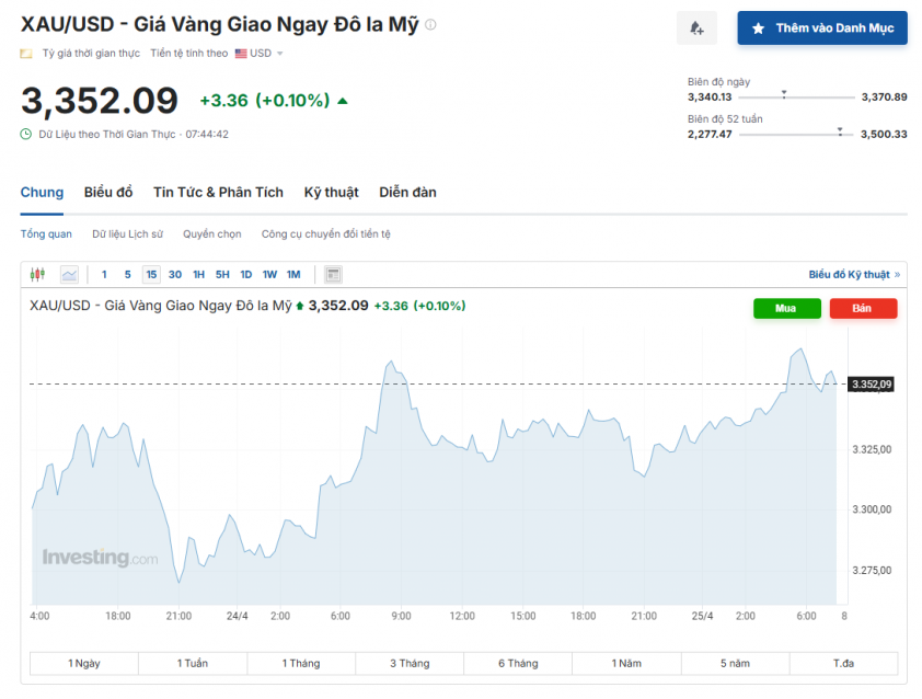Tính đến lúc 7h30 hôm nay 25/4/2025, trên thị trường thế giới, giá vàng giao ngay tăng nhẹ lên 3352,09 USD/ounce, tăng 3,36 USD (tương đương 0,1%) so với phiên hôm qua.