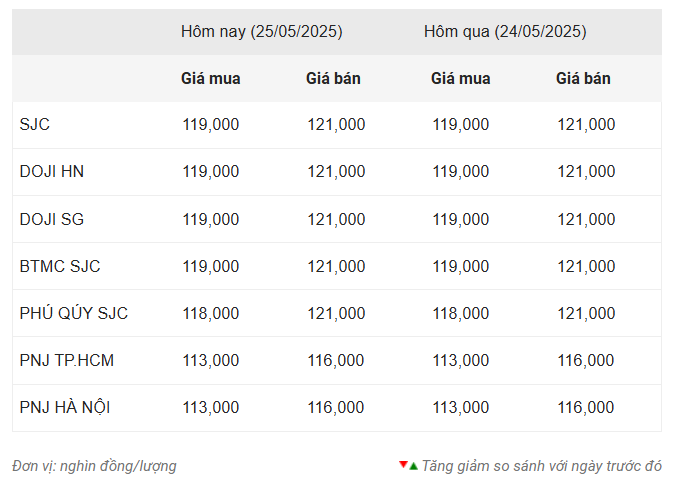 Tính đến 7h02 ngày hôm nay 25/5/2025, giá vàng miếng tạm thời đi ngang và tiếp tục duy trì ở trên mức 120 triệu đồng/lượng tại các hệ thống lớn như SJC, DOJI (Hà Nội và TPHCM) hay Bảo Tín Minh Châu. Theo đó, giá SJC, DOJI (Hà Nội và TPHCM) và BTMC SJC cùng niêm yết ở mức 119 triệu đồng/lượng chiều mua vào và 121 triệu đồng/lượng chiều bán ra, giữ nguyên ở cả 2 chiều so với ghi nhận vào chiều ngày hôm qua.