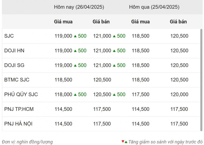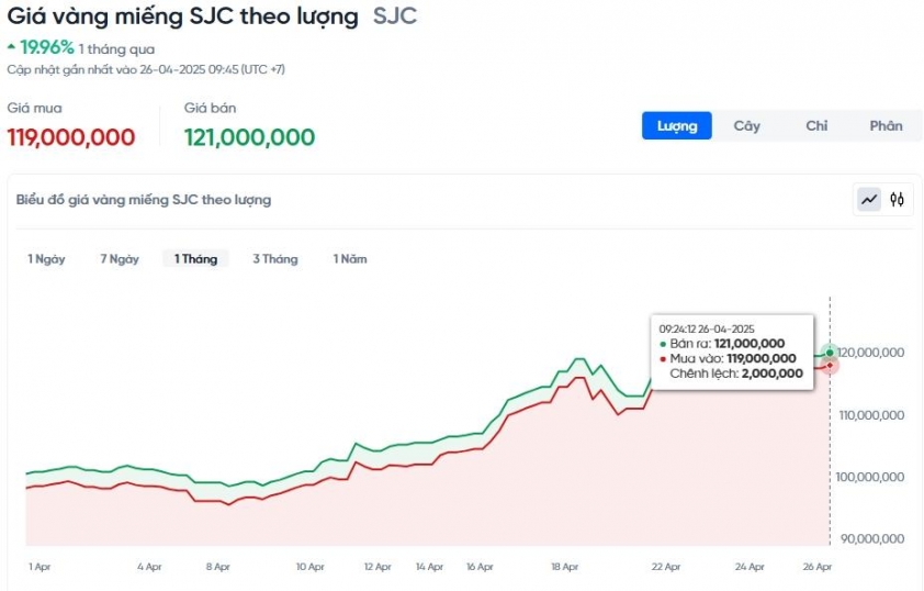 Tính đến 9h38 sáng ngày 26/04/2025, giá vàng trong nước đồng loạt ghi nhận xu hướng tăng so với phiên giao dịch ngày hôm qua. Cụ thể, tại hệ thống SJC, giá mua vào hiện ở mức 119 triệu đồng/lượng và giá bán ra là 121 triệu đồng/lượng, tăng 500 nghìn đồng mỗi chiều.