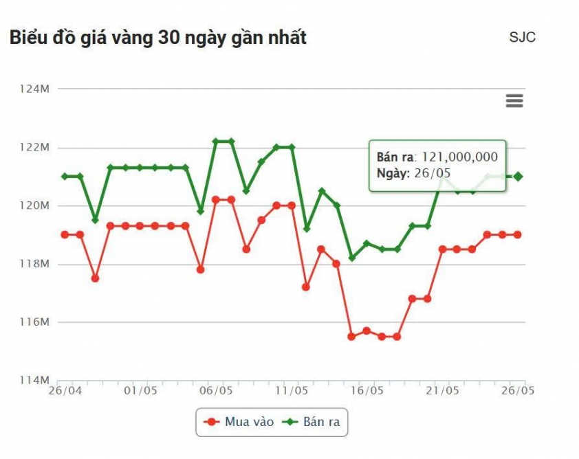 Tính đến 5h30 sáng nay (26/5/2025), giá vàng miếng trong nước vẫn duy trì ổn định, gần như không có biến động so với cuối tuần trước. Tại các hệ thống kinh doanh vàng lớn như SJC, DOJI ở cả Hà Nội và TP.HCM, giá mua vào tiếp tục được niêm yết ở mức 119 triệu đồng/lượng, trong khi giá bán ra đứng yên ở ngưỡng 121 triệu đồng/lượng.