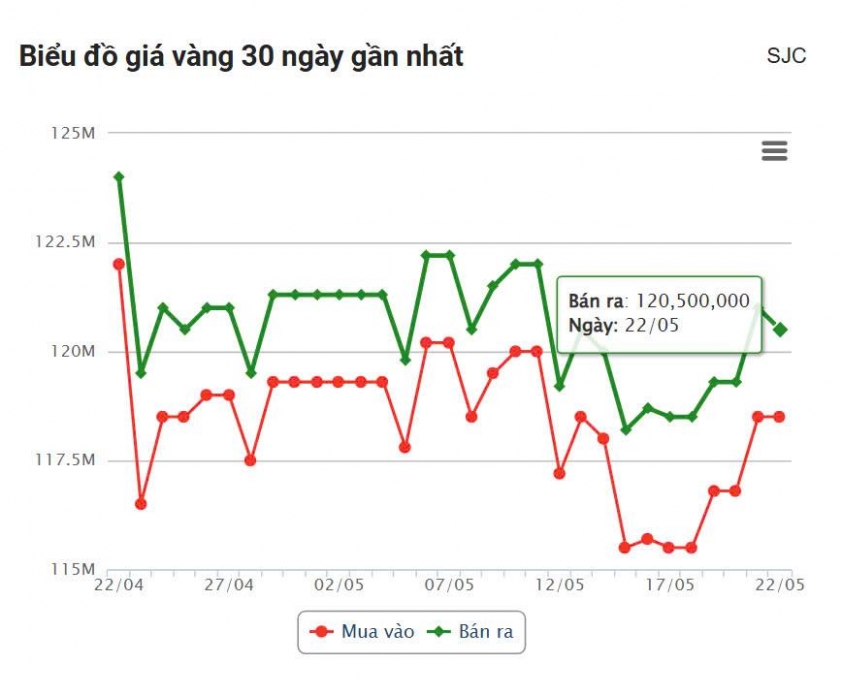 Giá vàng hôm nay ngày 22/5/2025 tính đến 19h30 bất ngờ điều chỉnh giảm nhẹ so với trưa cùng ngày, nhưng vẫn trụ vững trên ngưỡng 120 triệu đồng/lượng tại nhiều hệ thống kinh doanh lớn.