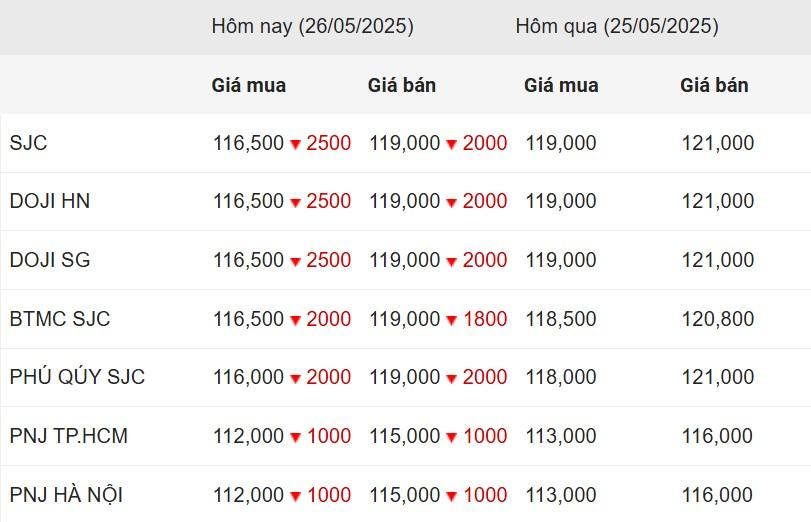 Giá vàng hôm nay ngày 26/5/2025 ghi nhận vàng miếng trong nước trải qua một phiên lao dốc mạnh, trong khi hầu hết thương hiệu lớn đồng loạt điều chỉnh giảm từ 1 đến 2,5 triệu đồng mỗi lượng.