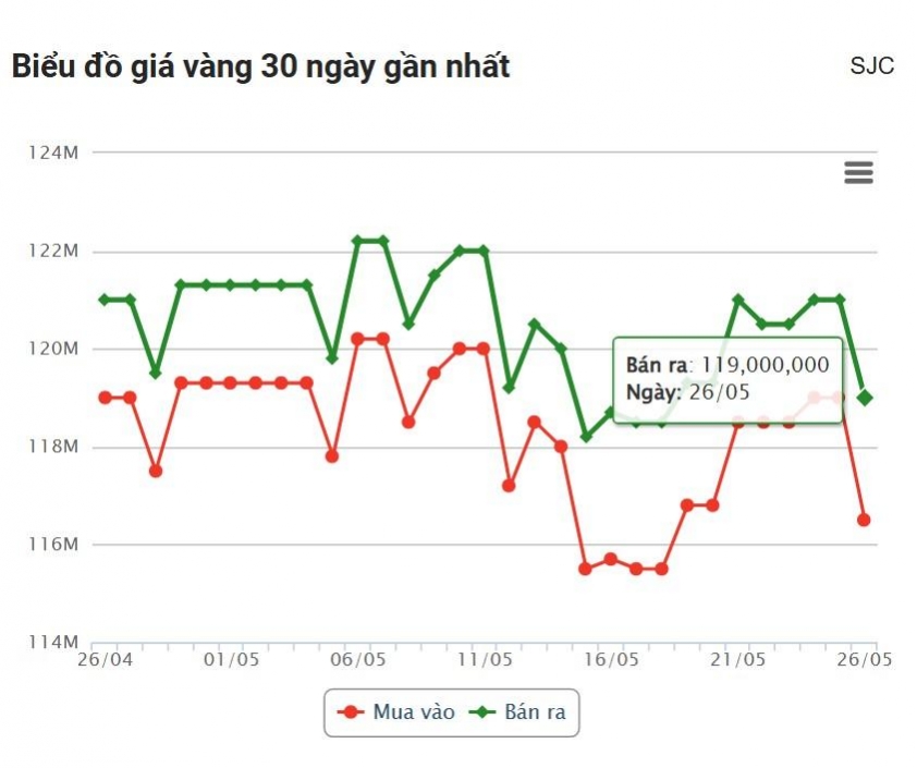 Sau nhiều phiên neo ở vùng cao, vàng miếng đã lùi về mốc 116,5 – 119 triệu đồng/lượng, đánh dấu một trong những phiên giảm sâu nhất kể từ đầu tháng 5 đến nay. Các doanh nghiệp khác như BTMC, Phú Quý cũng ghi nhận mức sụt giảm tương tự, trong khi PNJ đang là đơn vị có giá niêm yết thấp nhất, chỉ còn 112 – 115 triệu đồng/lượng.