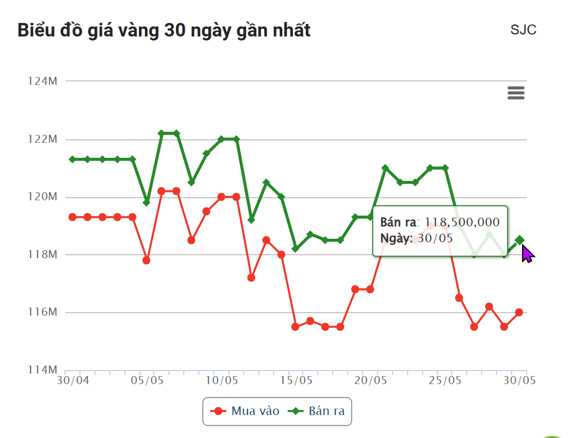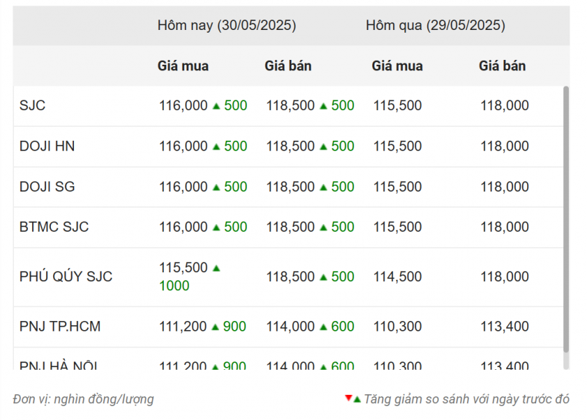 Tính đến 19h00 tối ngày hôm nay 30/5/2025, giá vàng miếng tại SJC, DOJI và Bảo Tín Minh Châu đồng loạt tăng 500 nghìn đồng ở cả hai chiều, hiện giao dịch quanh mức 116 triệu đồng/lượng (mua vào) và 118,5 triệu đồng/lượng (bán ra). Chênh lệch mua - bán là 2,5 triệu đồng.