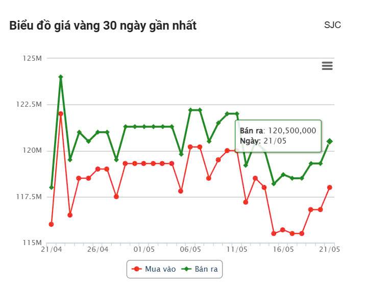 Giá vàng hôm nay ngày 21/5/2025 tăng hơn 1 triệu đồng mỗi lượng. Vàng miếng SJC tiến sát mốc 120,5 triệu đồng, theo đà phục hồi của thị trường thế giới.