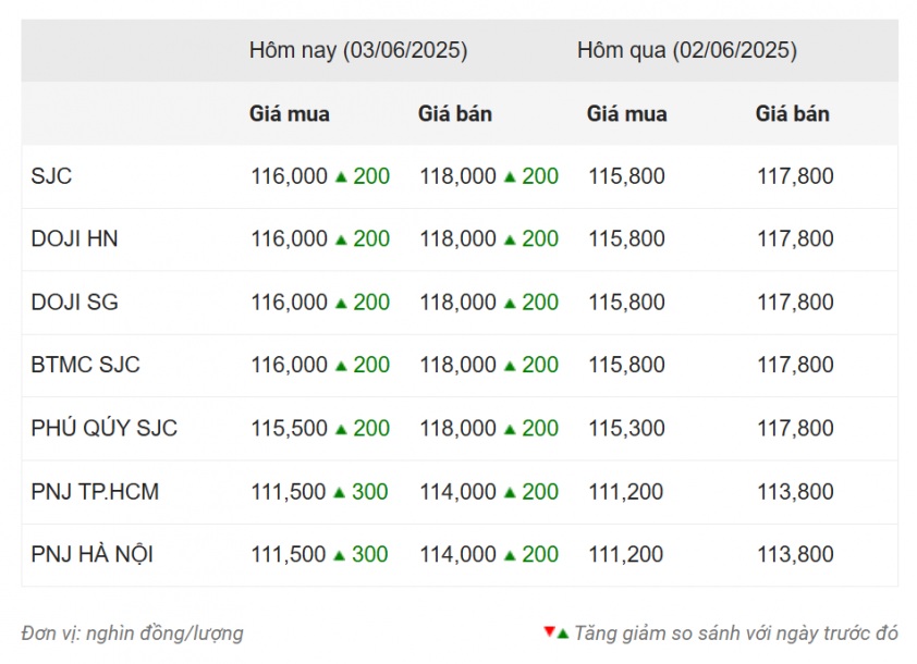Theo đó, SJC, DOJI (HN, TPHCM) và BTMC SJC neo ở mức giá 116 triệu đồng/lượng chiều mua vào và 116 triệu đồng/lượng chiều bán ra, đồng loạt tăng 200 nghìn đồng ở cả 2 chiều.