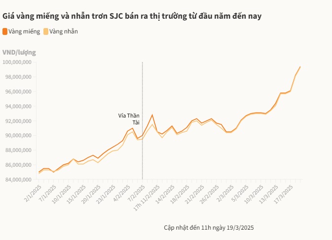 Vàng miếng đầu ngày tăng với biên độ tương tự và lập đỉnh mới. SJC, PNJ, Bảo Tín Minh Châu niêm yết mỗi lượng quanh 97,6 - 99,1 triệu đồng, tăng 500.000 đồng so với hôm qua. Đến 11h, mỗi lượng tăng thêm 300.000 đồng, đưa giá bán ra chạm 99,4 triệu đồng. Nếu so với đầu năm, mỗi lượng vàng hiện tăng khoảng 14 triệu đồng, tương đương hiệu suất sinh lời 16%.