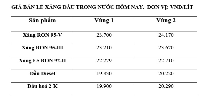 Giá bán lẻ xăng dầu trong nước nói trên đã được liên Bộ Tài chính - Công Thương điều chỉnh tại kỳ điều hành giá chiều 23.5. Theo đó, giá xăng E5 RON 92 tăng 162 đồng/lít; xăng RON95-III tăng 78 đồng/lít; dầu diesel 0.05S giảm 36 đồng/lít; dầu hỏa giảm 6 đồng/lít; dầu mazút 180CST 3.5S tăng 95 đồng/kg.