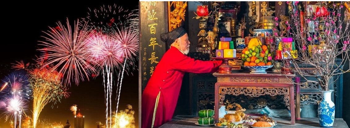 Người Việt Nam chú trọng nhiều hơn tới đêm giao thừa âm lịch. Theo phong tục từ cổ xưa, vào lúc tất niên và giao thừa nhà nhà đều cúng lễ ngoài trời và cúng lễ trong nhà, chuẩn bị chu đáo để đón người đến xông đất, mang tài thần vào nhà.