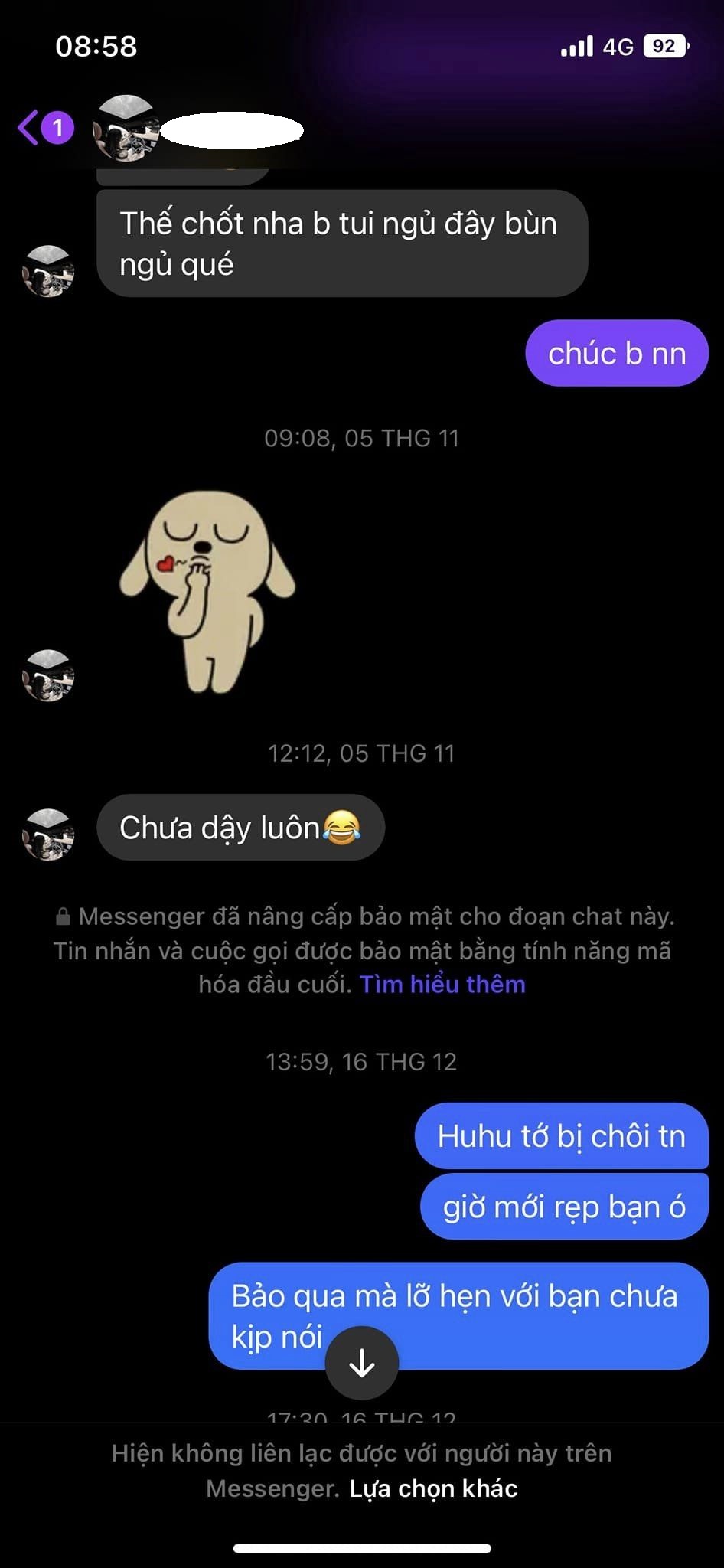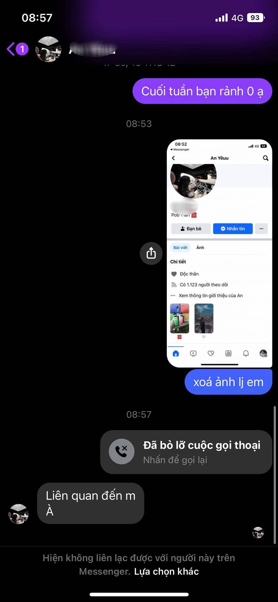 Tiếp đến, L có dùng chính tài khoản Facebook của Uyên để gọi cho An Yêuu thì bạn này không nghe máy, sau đó 1 lúc thì An Yêuu có nhắn tin lại hỏi “sao thế bạn?” thì L mới nhắn tin lại là “Anh là người nhà của Uyên anh thấy em là người nhắn tin cuối cùng với Uyên em có biết Uyên đang ở đâu không báo cho anh biết với?” thì được một lúc sau tài khoản An Yêuu này mới xóa hết tin nhắn giữa Uyên và An Yêuu đã nói chuyện trước đó, và chặn Face của Uyên luôn.