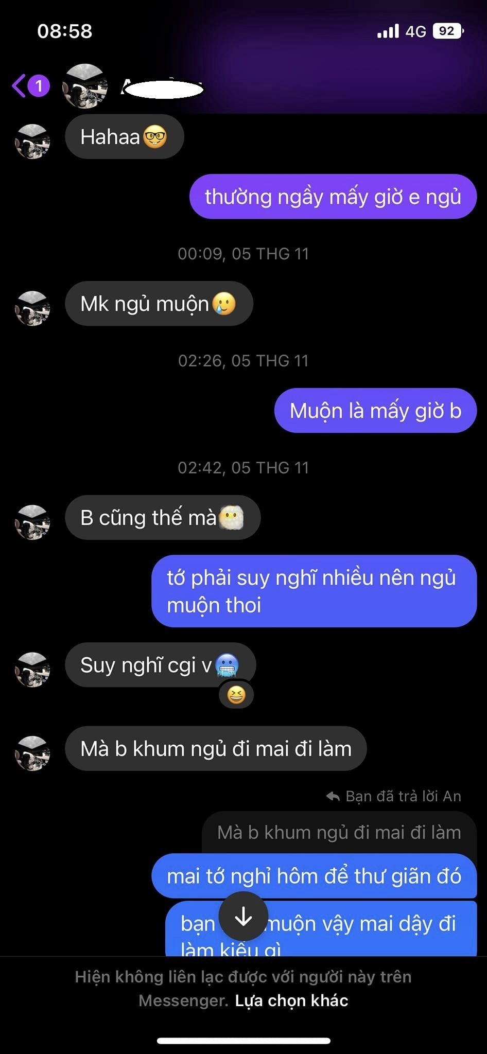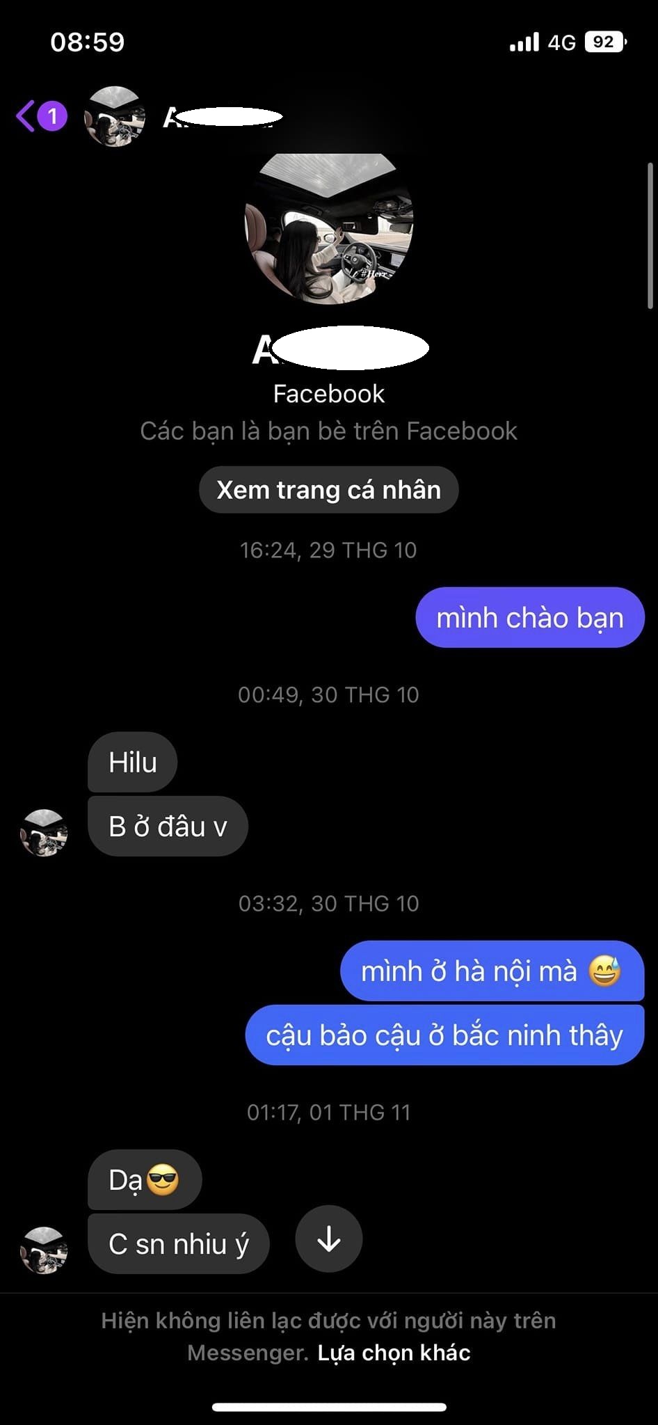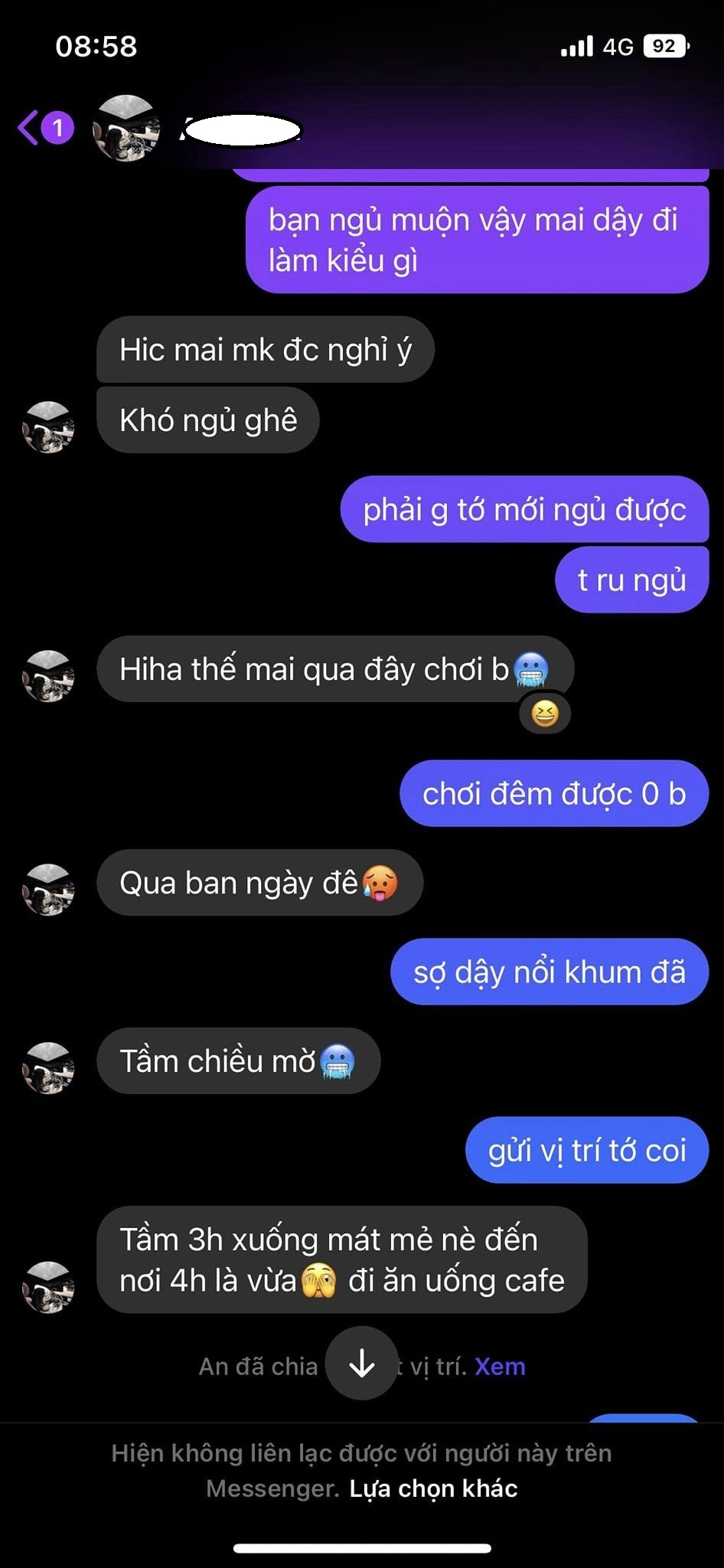 Đến tối hôm sau L có mở máy tính ở phòng làm việc của Uyên đang sử dụng và truy cập vào facebook của Uyên đã đăng nhập sẵn để tìm kiếm thông tin xem Uyên có nhắn tin với ai và đi đâu không thì có thấy Uyên nhắn tin qua lại với một tài khoản facebook tên là “An Yêuu” (ảnh cô gái ở dưới bài, đây là tên nick facebook bạn gái đó) trong đoạn hội thoại L có đọc sơ bộ là cuộc trò chuyện tình tứ trai gái, hẹn hò; bạn “An Yêuu” này có hẹn Uyên tới chỗ bạn này chơi và có gửi kèm 1 định vị tại Bắc Ninh để Uyên đi tới đó.